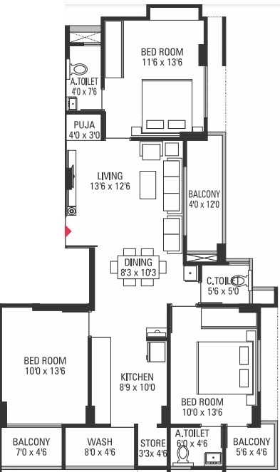 3BHK+3T (955.19 sq ft)