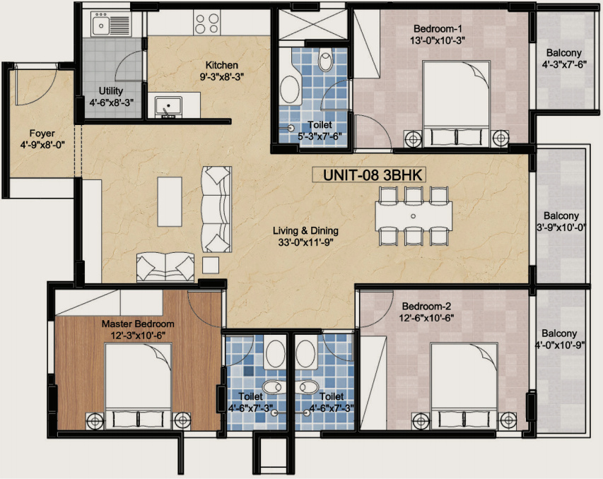 3BHK+3T (1,490 sq ft)