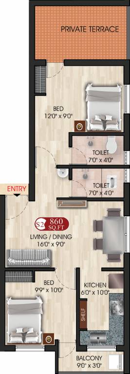 2BHK+2T (860 sq ft)