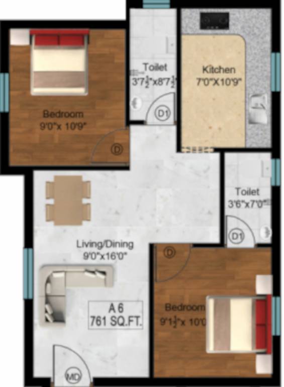 2BHK+2T (761 sq ft)