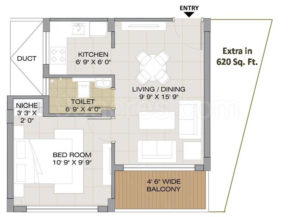 1BHK+1T (620 sq ft)