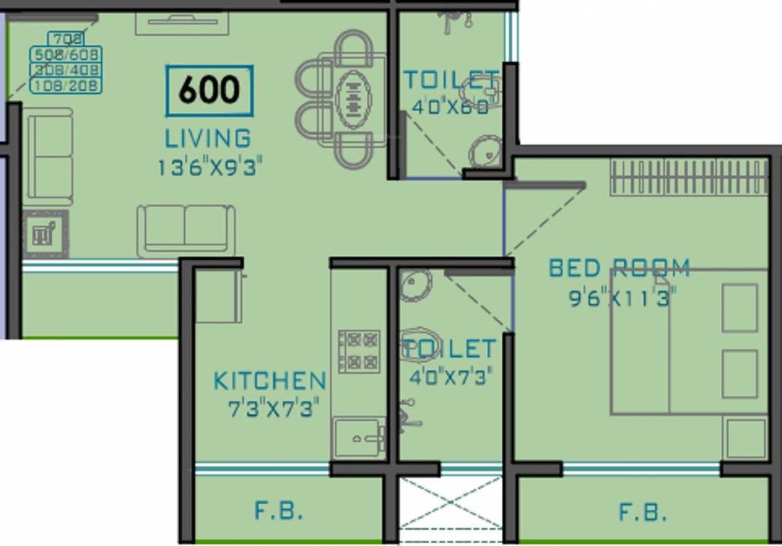 1BHK+2T (600 sq ft)