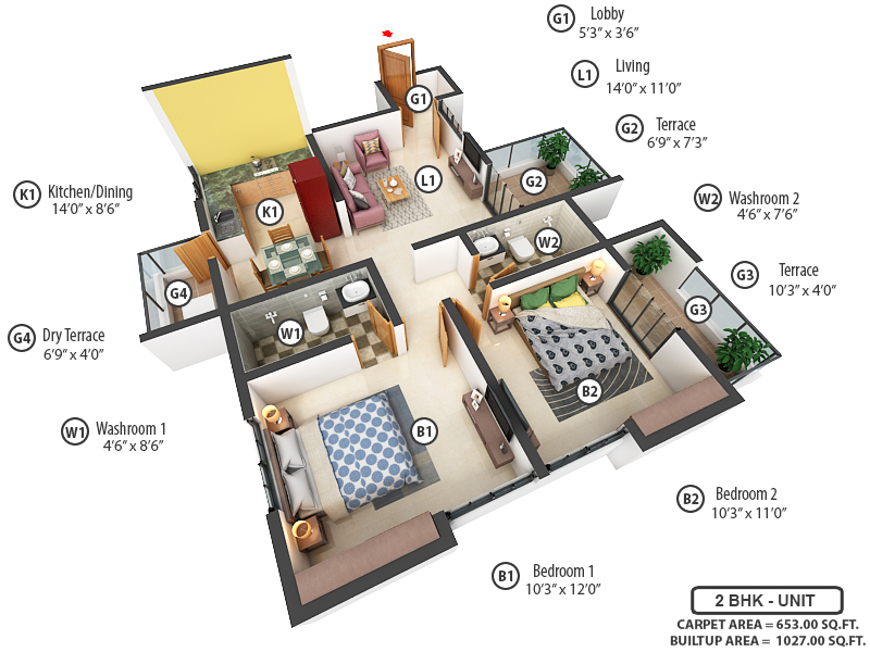 2BHK+2T (1,027 sq ft)