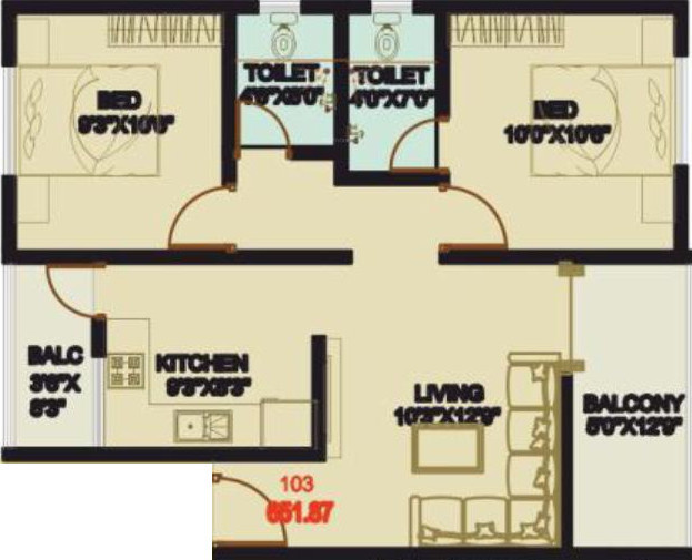 2BHK+2T (661.87 sq ft)